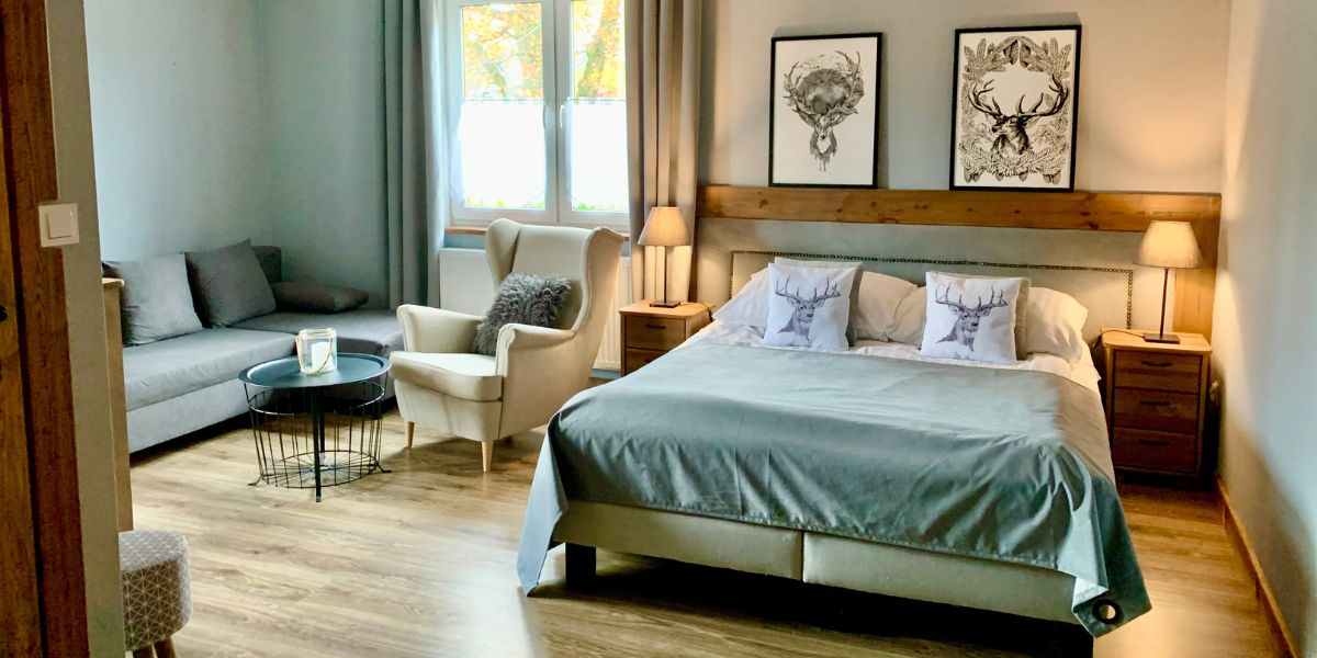 Przestronny pokój oferuje wygodne łóżko oraz miejsce do relaksu z fotelem i stolikiem. Znajduje się w nim także rozkładana sofa, która może służyć jako dodatkowe łóżko dla trzeciej osoby. Pokój posiada prywatną łazienkę, balkon oraz lodówkę.