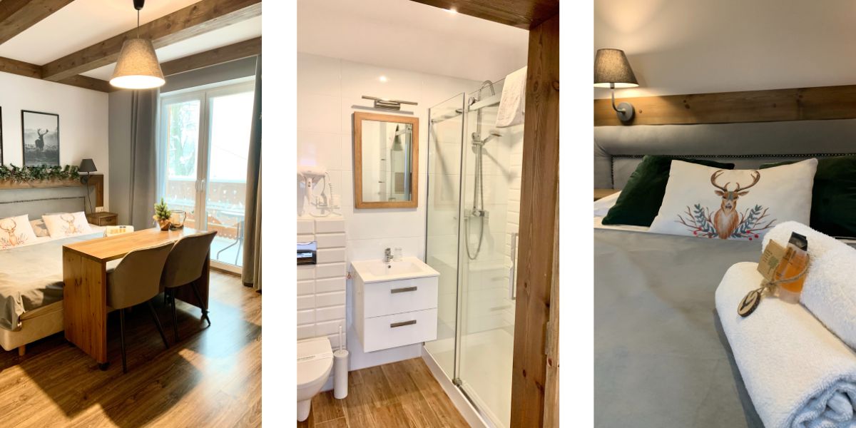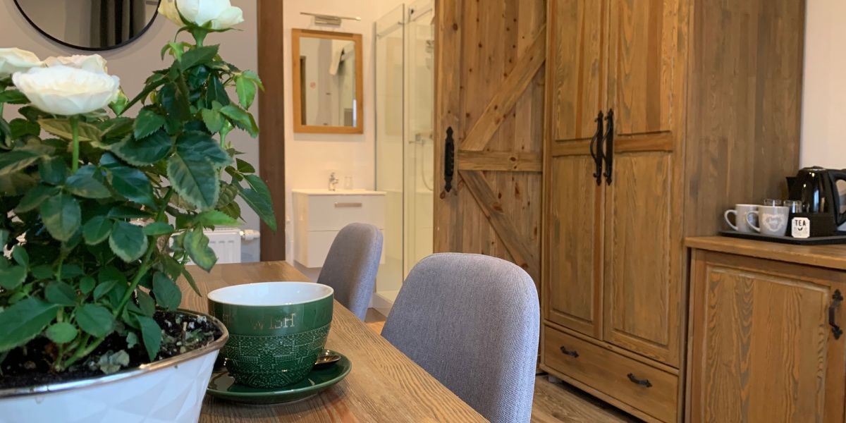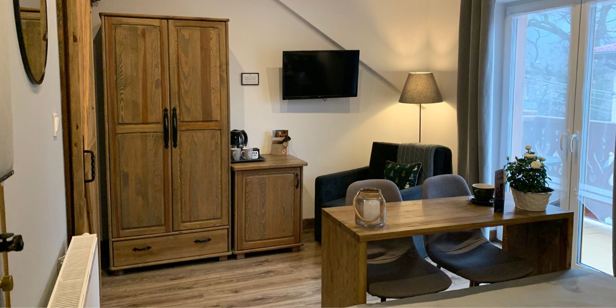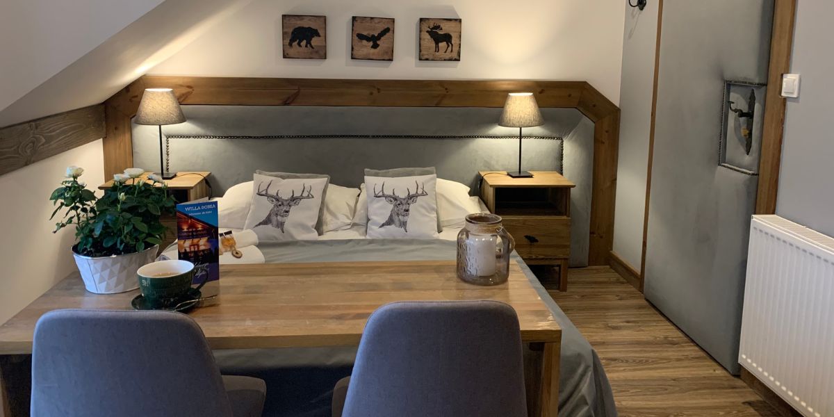 Komfortowy pokój dwuosobowy wyposażony jest w zestaw do parzenia kawy i herbaty, lodówkę, wygodne dwuosobowe łóżko oraz przestronną szafę.