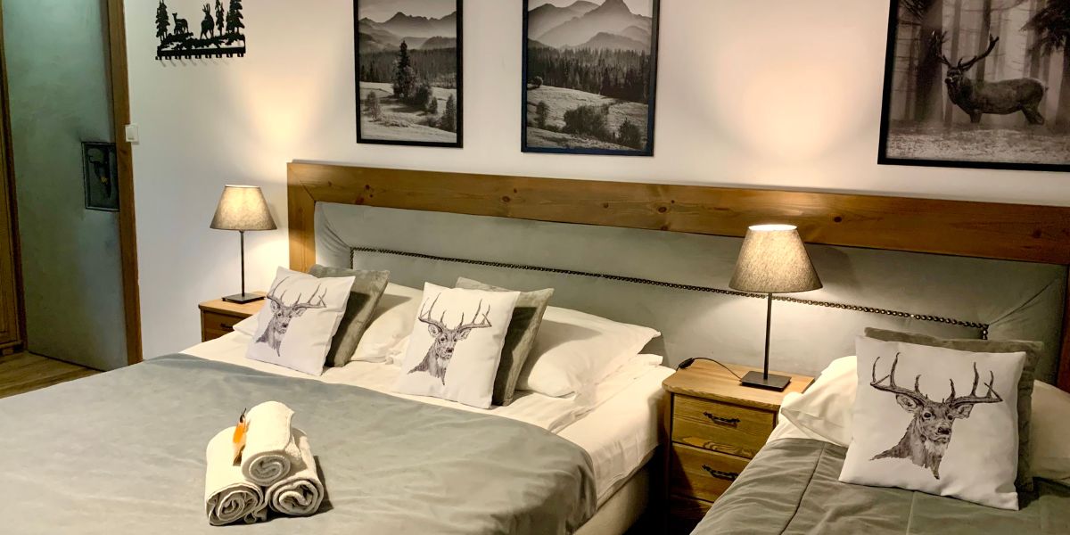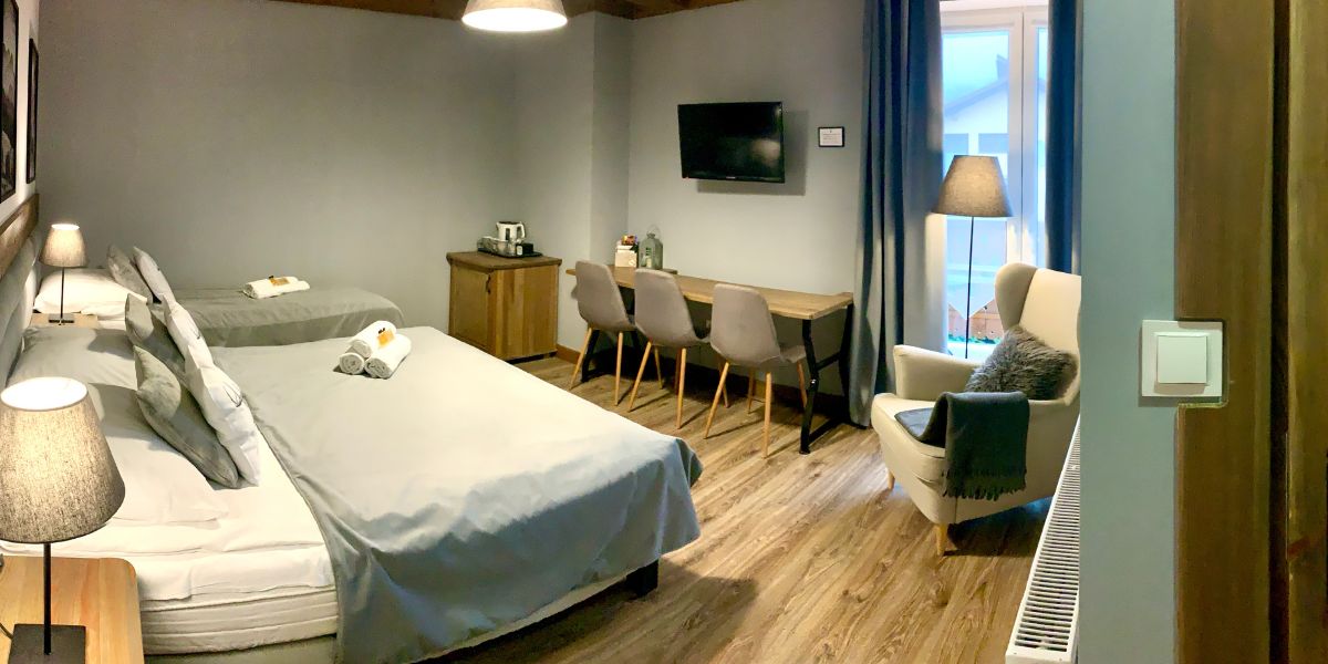 Praktyczny i wygodny pokój dla trzech osób wyposażony jest w zestaw do parzenia kawy i herbaty, lodówkę, wygodne łóżko podwójne oraz dodatkowe łóżko pojedyncze.